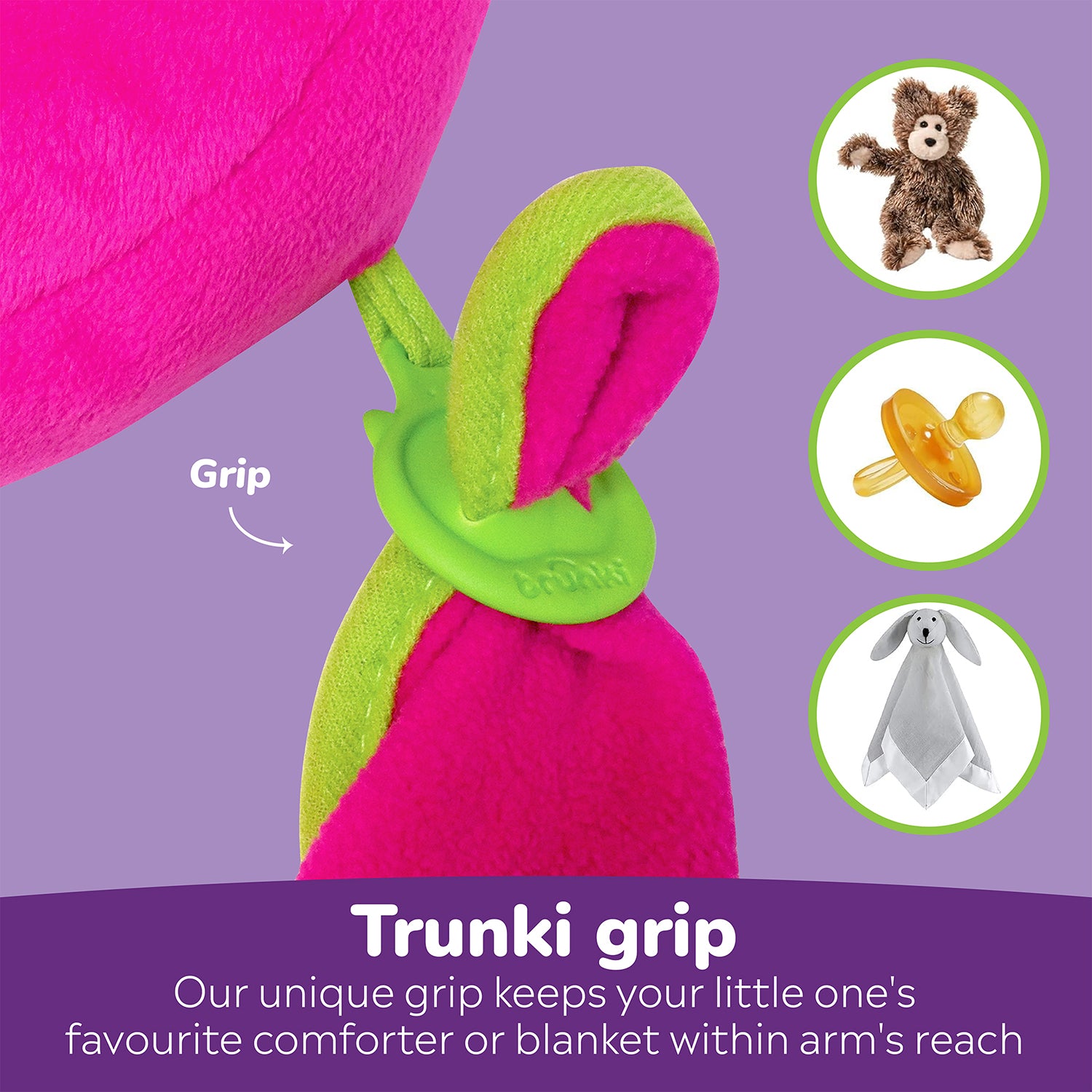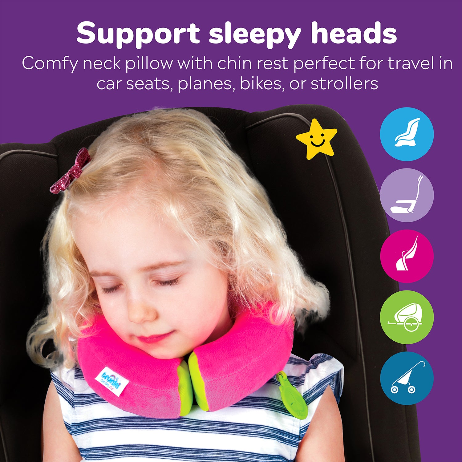 Ergonomically designed with a narrow profile to provide extra support when using child seats with existing headrests; perfect for car seats, plane seats, bike seats and also for buggies and strollers. It also comes with the unique Trunki Grip (TM) so your little one can attach their favorite comforter or blanket.